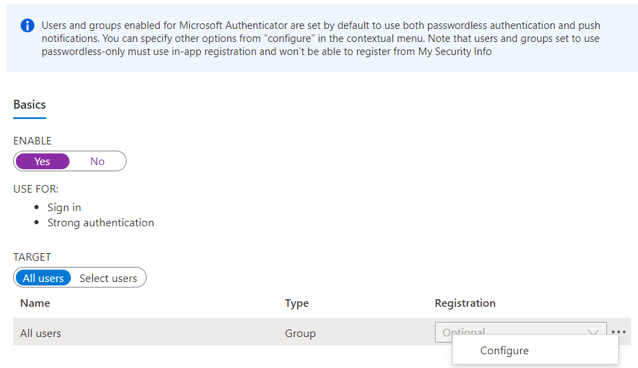 - Enable this method, if not currently enabled, and configure the scope - I strongly recommend using the default All Users. Now click on the menu button, and then Configure.