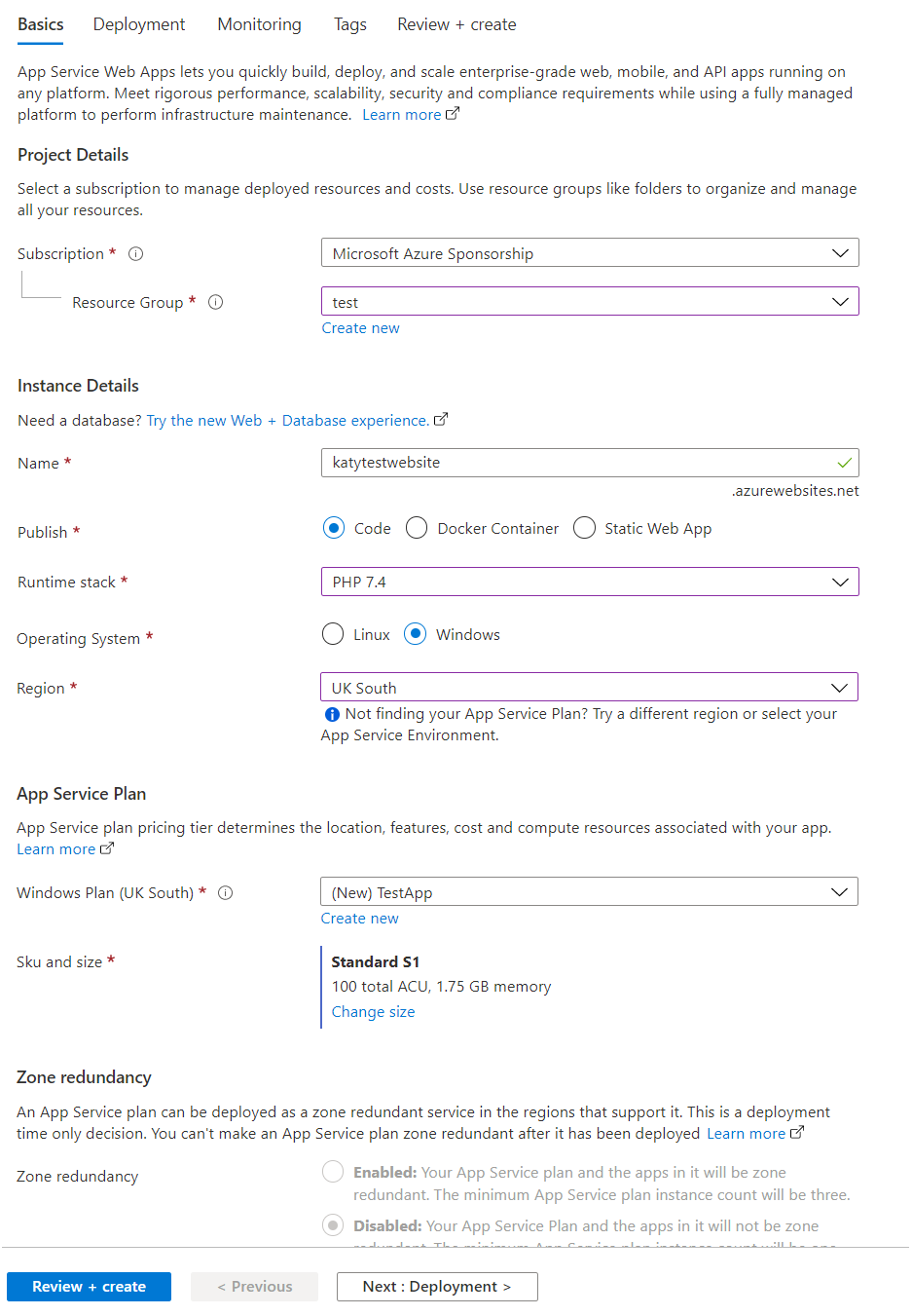My next step was to set up the Azure App Service. I picked the appropriate plan based on traffic and visitor stats, and went for one of the Standard plans. I initially looked at a Linux based service but couldn't change the web root from the Azure portal (although you can do this with a .htaccess file), so in the end went with Windows. To create the Azure App Service, you'll need an Azure subscription. The app service is set up and managed from the App Service section of the Azure portal. When creating the web app, you'll need to pick a name which is unique across all of Azure, it doesn't really matter what you pick for this as in a later step you can add your own domain.