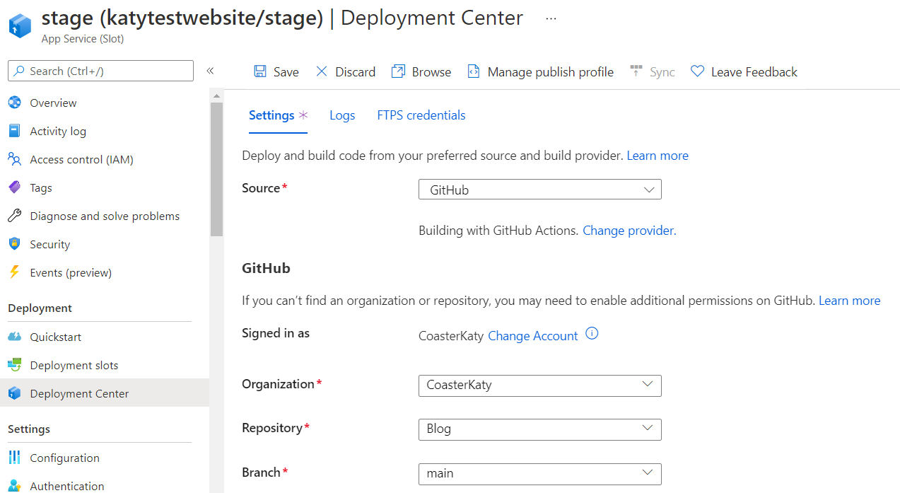 Now we've configured the settings, we should create a new deployment slot, I've called mine stage and told it to copy settings from the production slot. The idea with this is that we link the staging deployment slot to our GitHub repository, and using GitHub Actions we have it automatically deploy whenever the repository is updated. Once you've tested the deployment you can then swap the slot with the production slot, making the new code live.