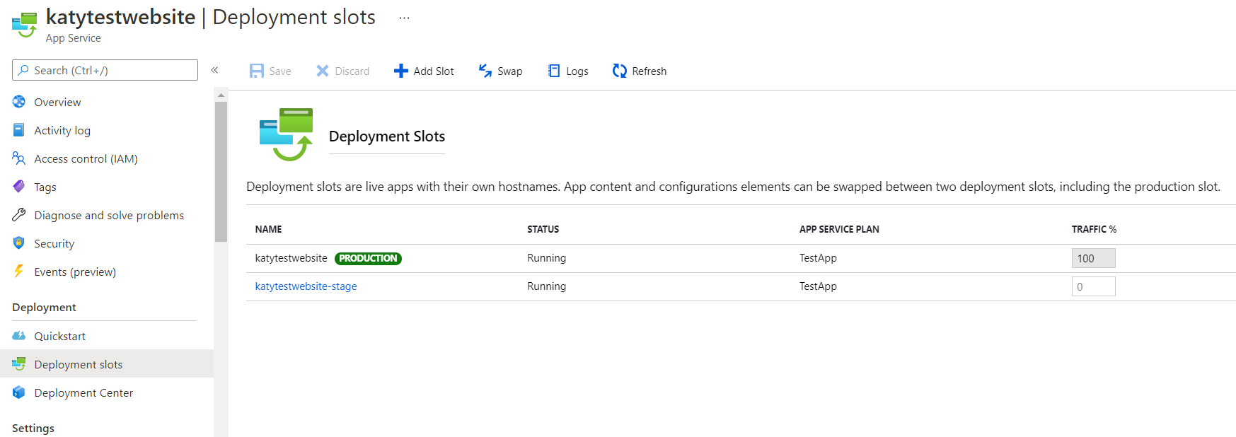 In the list above I mentioned staging slots - by default your app has a single slot (production), you can add additional slots which function as a separate app for testing purposes. Once you are happy your test slot is working fine you can swap it into the production slot.