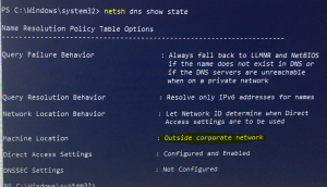 I went through the usual Direct Access troubleshooting: - netsh namespace show effectivepolicy - all appearing as it should - netsh dns show state - this said I was outside the corporate network - Get-DAConnectionStatus - this said I was connected locally, as does the Windows Settings UI.