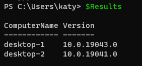 You can see from the output that desktop-1 is already running 21H1, and desktop-2 is stuck on 2004. The version numbers can be found on the Microsoft Docs.