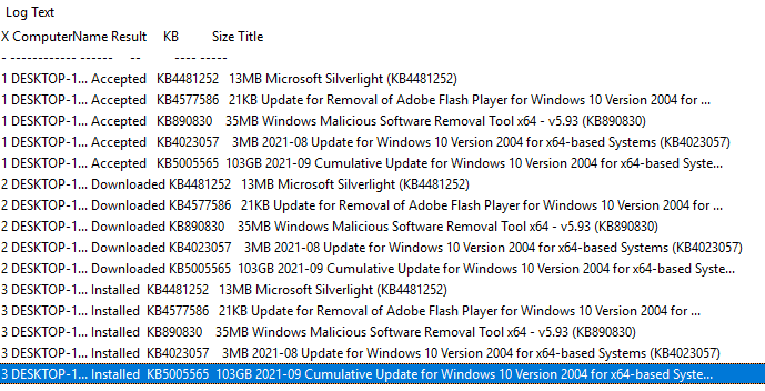 We can monitor the output if we wish, by viewing C:\Windows\PSWindowsUpdate.log on any of the devices, ideally in CMTrace or a similar tool which allows for "live viewing" a file as it updates. The output will show the computer name, status, KB number, size and title of each update - they'll list three times once it's completed, as shown in the screenshot: