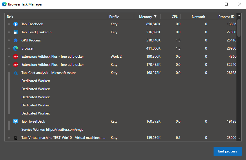 Ever wanted to see which tabs are using all your resources? There's always one culprit that's top of the list, but looking in the system Task Manager won't show you much besides "msedge.exe". Using Browser Task Manager you can view the tab name, browser profile it's running on and the memory, CPU and network usage, along with the process ID should you want to hunt it down in Task Manager and kill it. You can find this on the menu under More Tools > Browser Task Manager or by pressing Shift + Escape.