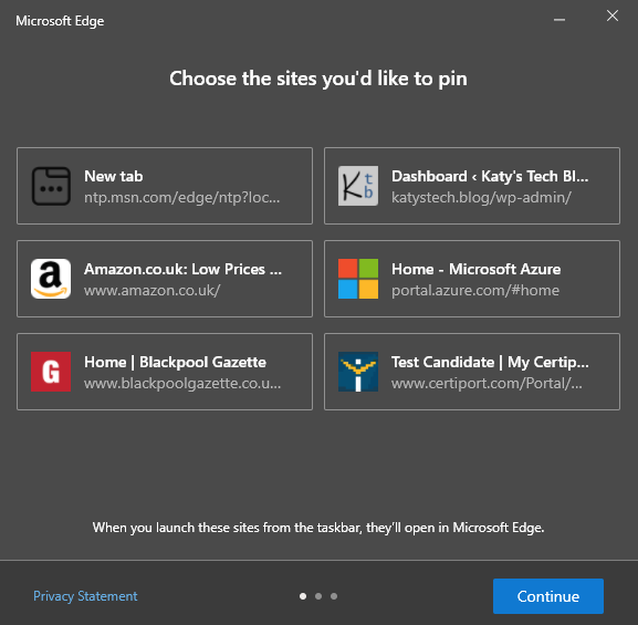 Ever wanted to pin a frequently used website to the task bar? Now you can! You can find the Taskbar Pinning Wizard on the menu under More Tools > Taskbar Pinning Wizard. This will give you 6 suggestions, based off sites you most frequently access. Tick the ones you want and click Next.