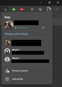 Edge supports syncing your favourites, settings, autofill data, saved passwords, extensions and collections. Coming in a future release it will support syncing open tabs and history too. But what if you have multiple accounts that you want to use - especially if working from home, such as a work account and a personal account? Just add a separate profile - it will have its own separate settings, and if signed in with an Azure AD account will automatically log in to most Office 365 sites rather nicely. Click on the profile image next to the Settings button to manage your profile and add more profiles. You can then open Edge windows in separate profiles by simply clicking on the profile you want to use. Day to day I have 3 or 4 different Edge windows running on different profiles, keeping my work stuff separate from my personal.