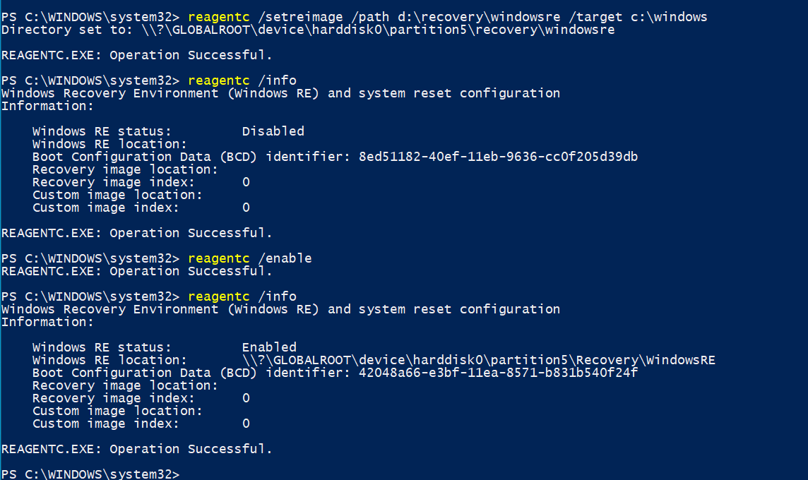 reagentc /setreimage /path R:\Recovery\WindowsRE /target C:\Windows