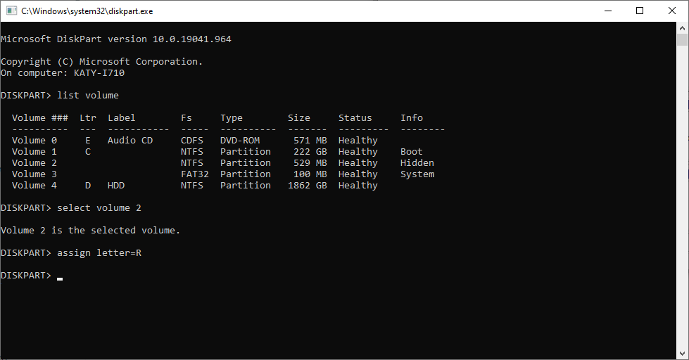 We can now clear up the drive letter assignment in the diskpart window (assuming you didn't close it) by running remove letter=R.